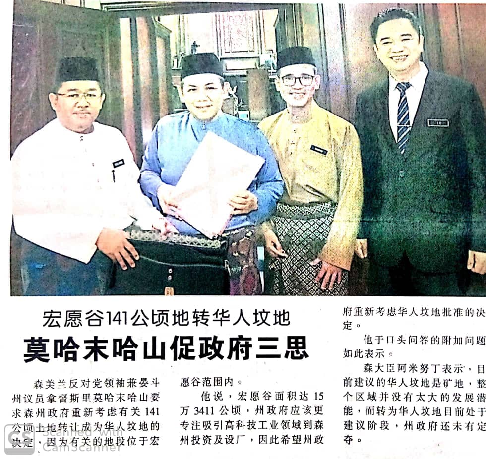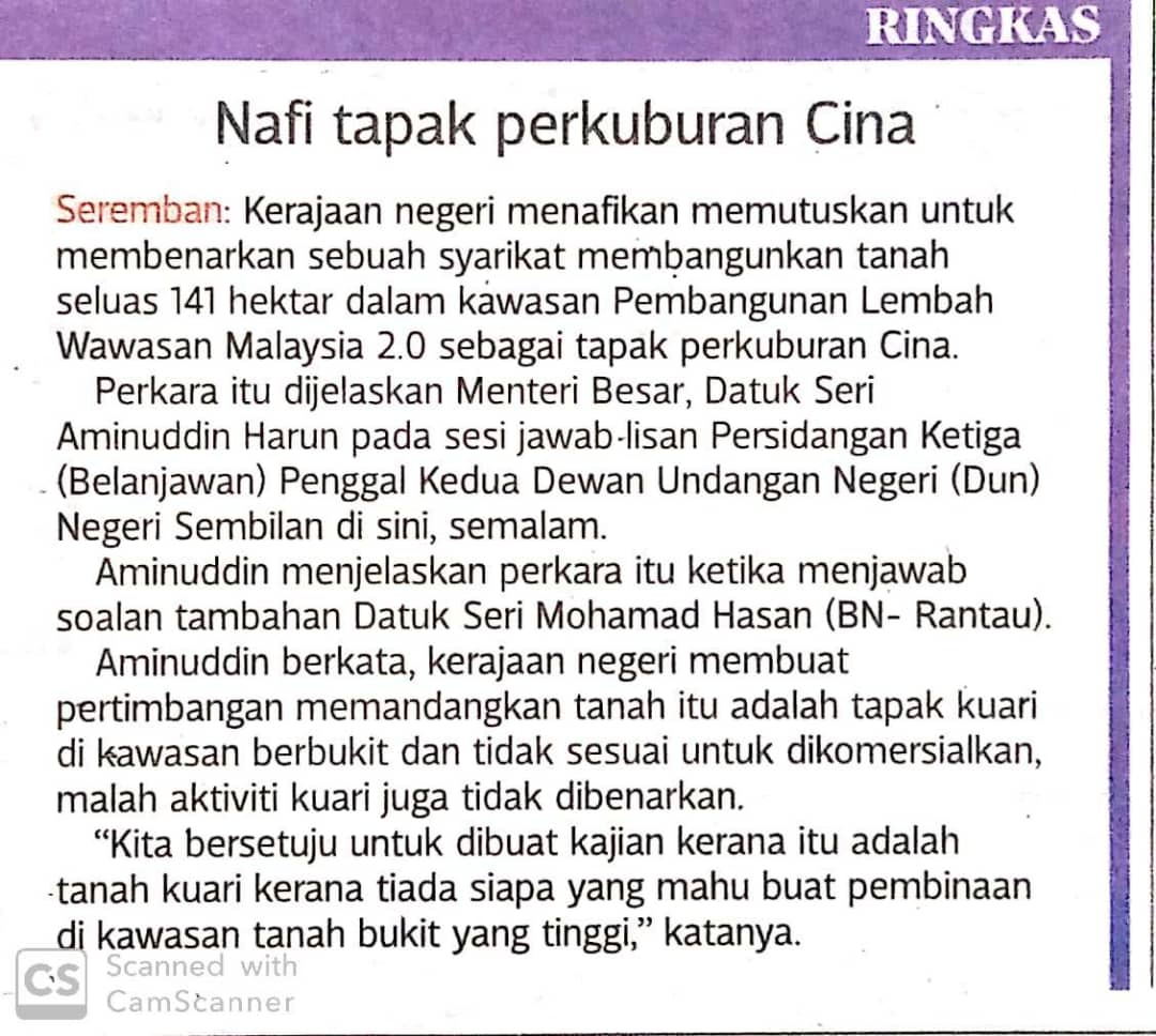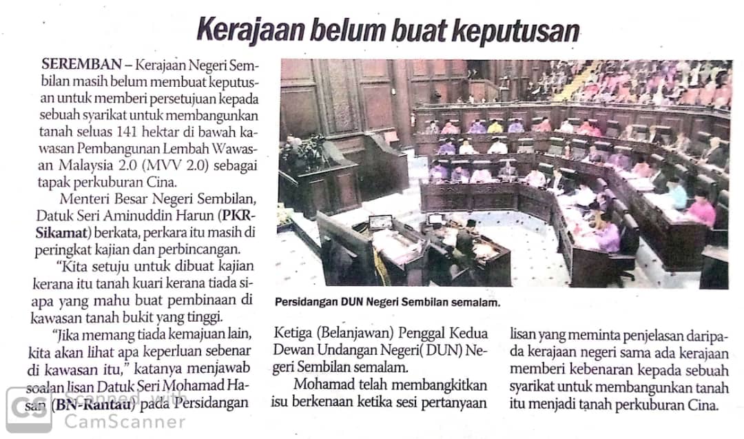 Tajuk :Seremban- Kerajaan Negeri Sembilan masih belum membuat keputusan untuk memberi persetujuan kepada sebuah syarikat untuk membangunkan tanah seluas 141 hektar sebagai tapak perkuburan cina di kawasan MVV 2.0, ujar MBNS perkara tersebut masih dalam perbincangan.