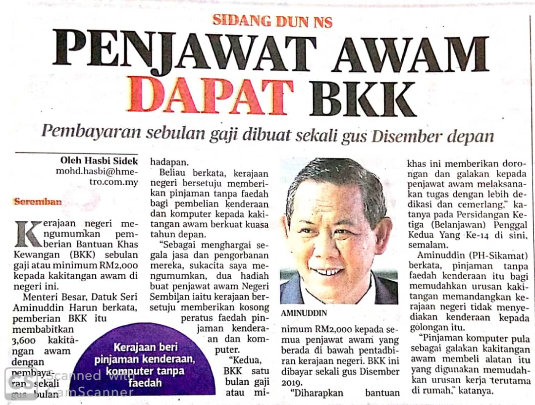 Tajuk :Seremban- Berita gembira buat kira-kira 3,600 penjawat awam di negeri ini akan menerima bantuan khas Kewangan (BKK) sebulan gaji atau minimum RM2,000 hujung bulan depan disamping berpeluang juga menerima pinjaman tanpa faedah bagi pembelian kenderaan dan komputer. MBNS berharap bantuan tersebut akan memberi dorongan kepada penjawat awam dalam melaksanakan tugas dengan lebih cemerlang.