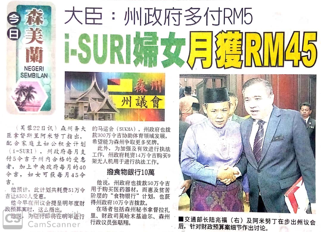 Tajuk :Seremban- MBNS mengumumkan penambahan RM5 Insentif Suri (i-Suri) kepada sesiapa yang telah berdaftar menjadikan penerima akan menerima RM45 berbanding sebelum ini.