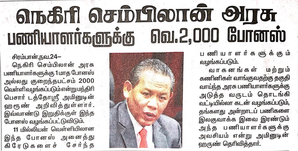 Tajuk :Seremban:MBNS mengumumkan bahawa kakitangan kerajaan Negeri Sembilan akan diberi bantuan khas sebulan gaji atau minimum 2000 kepada kakitangan awam di negeri ini.