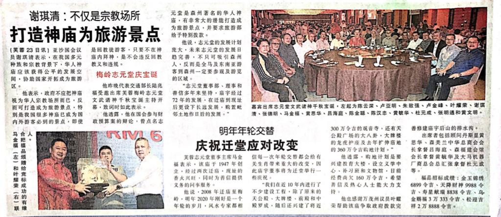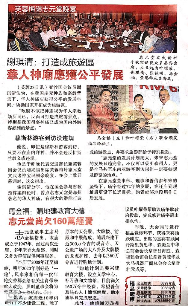 Tajuk :Seremban:YB Tuan Yap Yew Weng berkata kuil-kuil Cina perlu membuat penaikan taraf bangunan supaya ia boleh menjadi tempat pengunjungan para pelancong.Beliau berkata kebanyakan kuil cina mempunyai ciri-ciri yang boleh menarik para pelancong untuk datang melawat dan secara tidak langsung ia boleh membantu negara kita berkembang menjadi salah satu pusat pelancongan yang menarik.