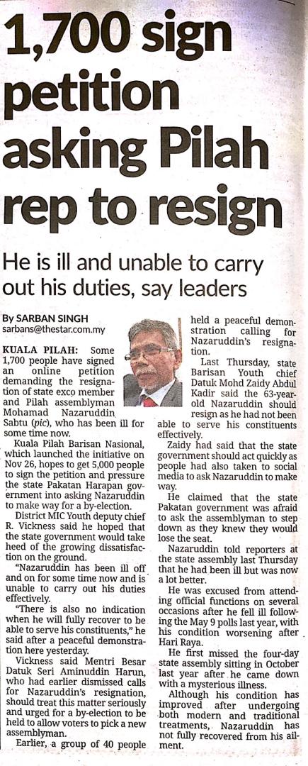 Tajuk :1,700 sign petition asking Pilah rep to resign