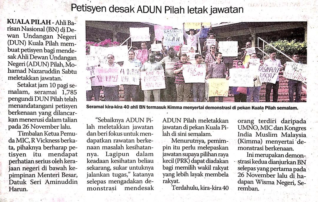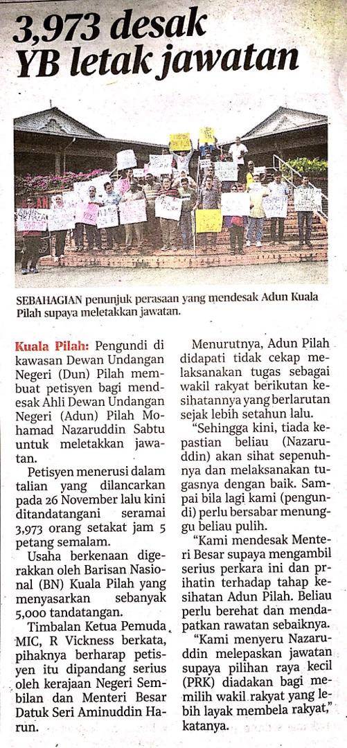 Tajuk :Petiysen desak ADUN Pilah letak jawatan