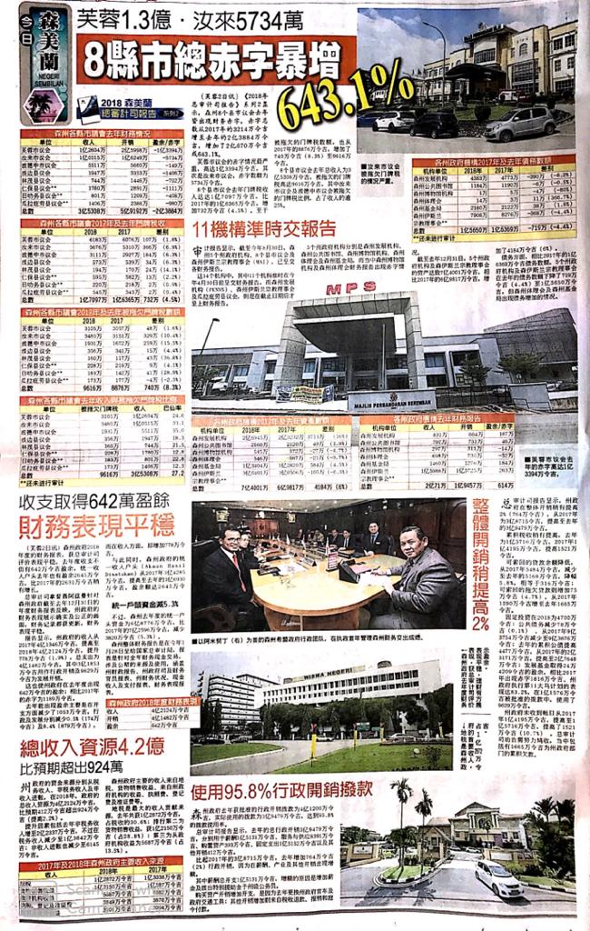 Tajuk :Seremban:Laporan Ketua Audit Negara 2018 menunjukkan bahawa lapan dewan daerah dan bandar di Negeri Sembilan mempunyai defisit kewangan tahun lepas dan jumlah defisit meningkat daripada RM32.14 juta pada 2017 kepada RM238.84 juta tahun lepas.