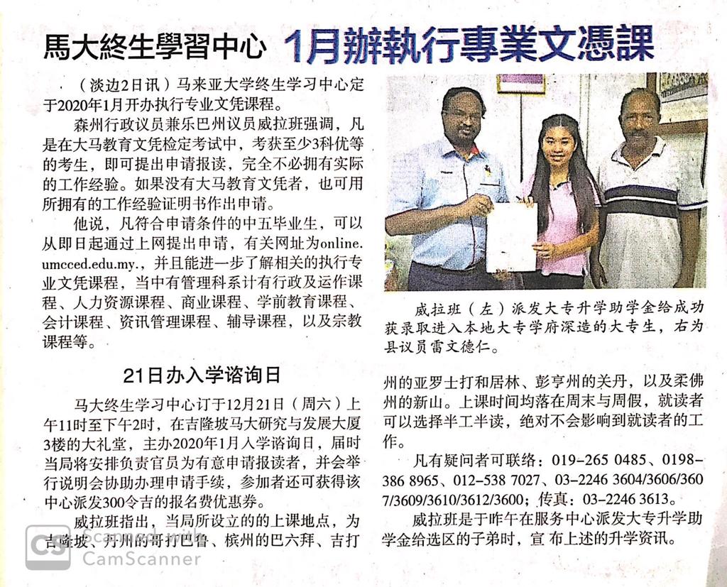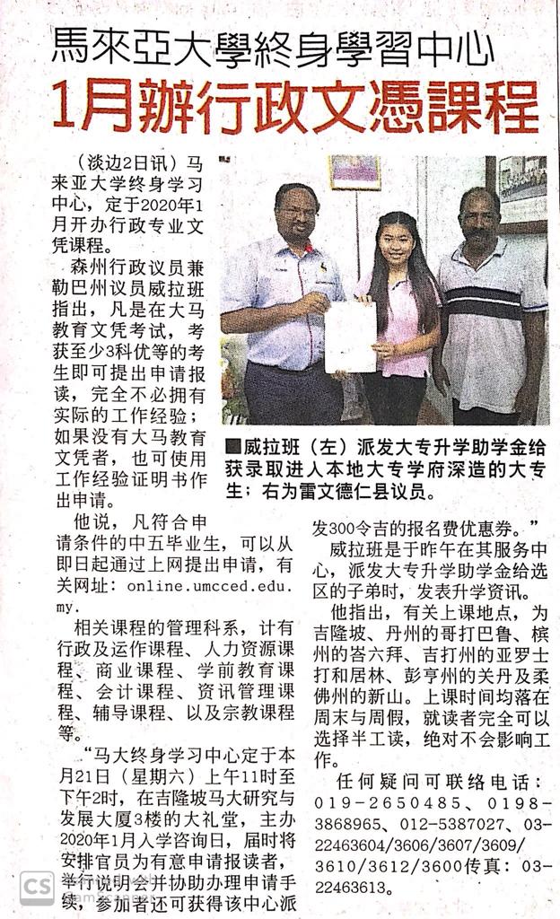 Tajuk :Tampin:Diploma Eksekutif di Universiti Malaya akan bermula pada Januari tahun depan dan permohonan boleh dilakukan melalui online di online.umcced.edu.my ujar YB Tuan Veerapan semasa memberi sumbangan pendidikan.