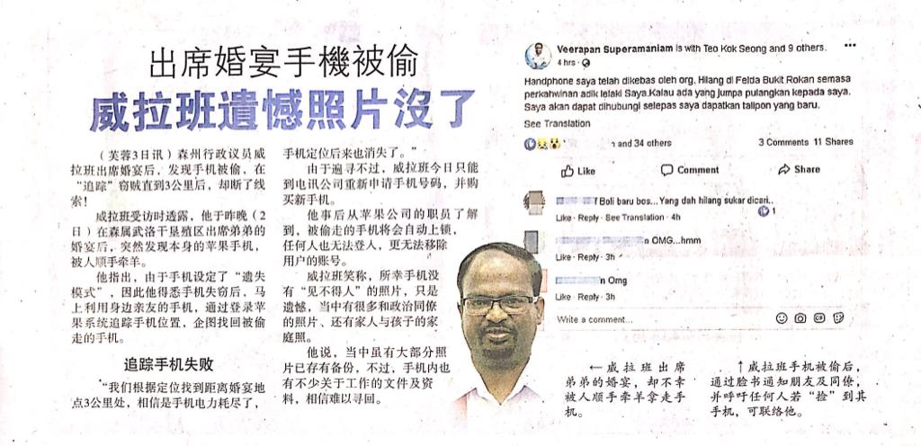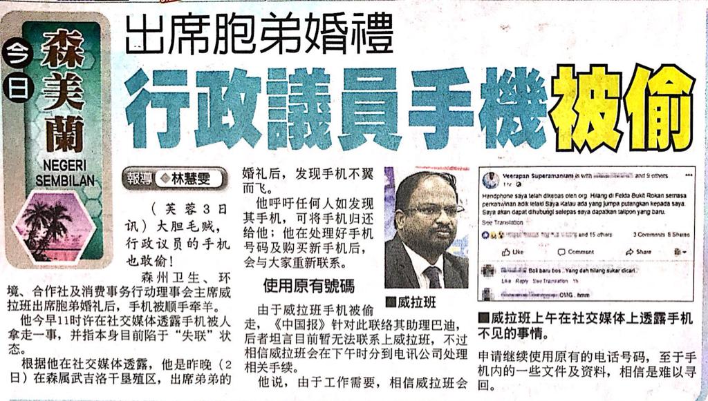 Tajuk :Seremban:YB Tuan Veerapan menyatakan bahawa telefon bimbitnya telah hilang semasa beliau menghadiri majlis perkahwinan adik lelakinya di Felda Bukit Rokan.