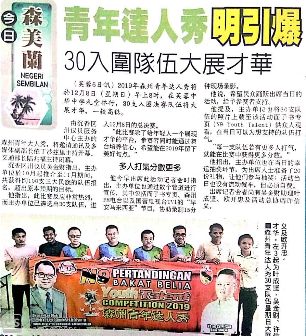 Tajuk :Seremban- YB Tn Ng Chin Tsai bersama jawatankuasa turut mempromosikan program "N9 Youth Talent Competition 2019" yang bakal berlangsung esok.