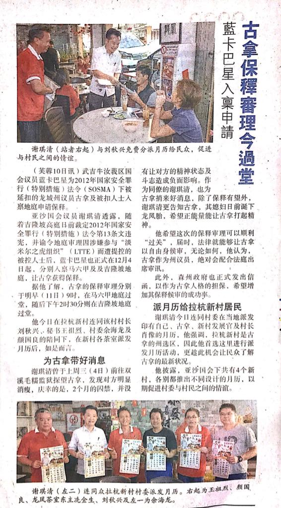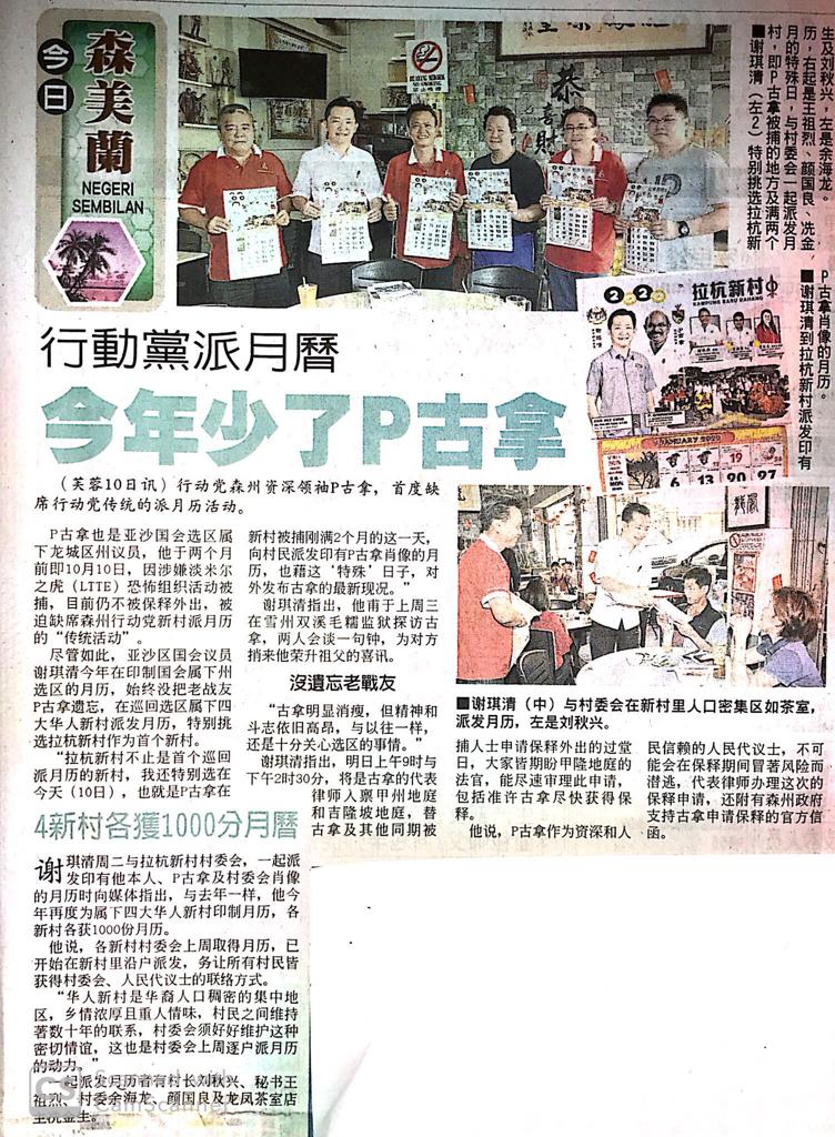 Tajuk :Seremban:YB Tuan Cha Kee Chin telah mengedarkan kalendar 2020 di kawasan Kampung Baru Rahang bagi mewakili YB Tuan Gunasekaran.