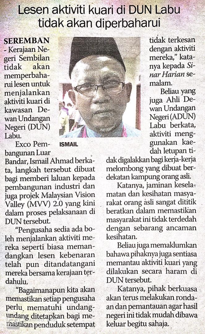 Tajuk :Lesen aktiviti kuari di DUN Labu tidak akan diperbaharui