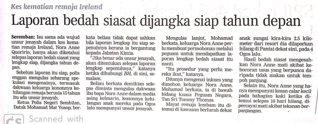 Tajuk :Laporan bedah siasat Nora Anne dijangka siap tahun depan