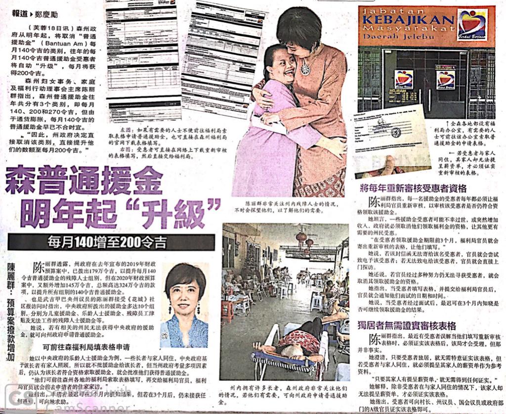 Tajuk :Seremban:Menurut YB Puan Nicole berkata terdapat penaikan didalam bantuan am pada tahun hadapan.Beliau juga berkata borang permohonan boleh dimuat turun daripada laman web rasmi Jabatan Kebajikan Masyarakat