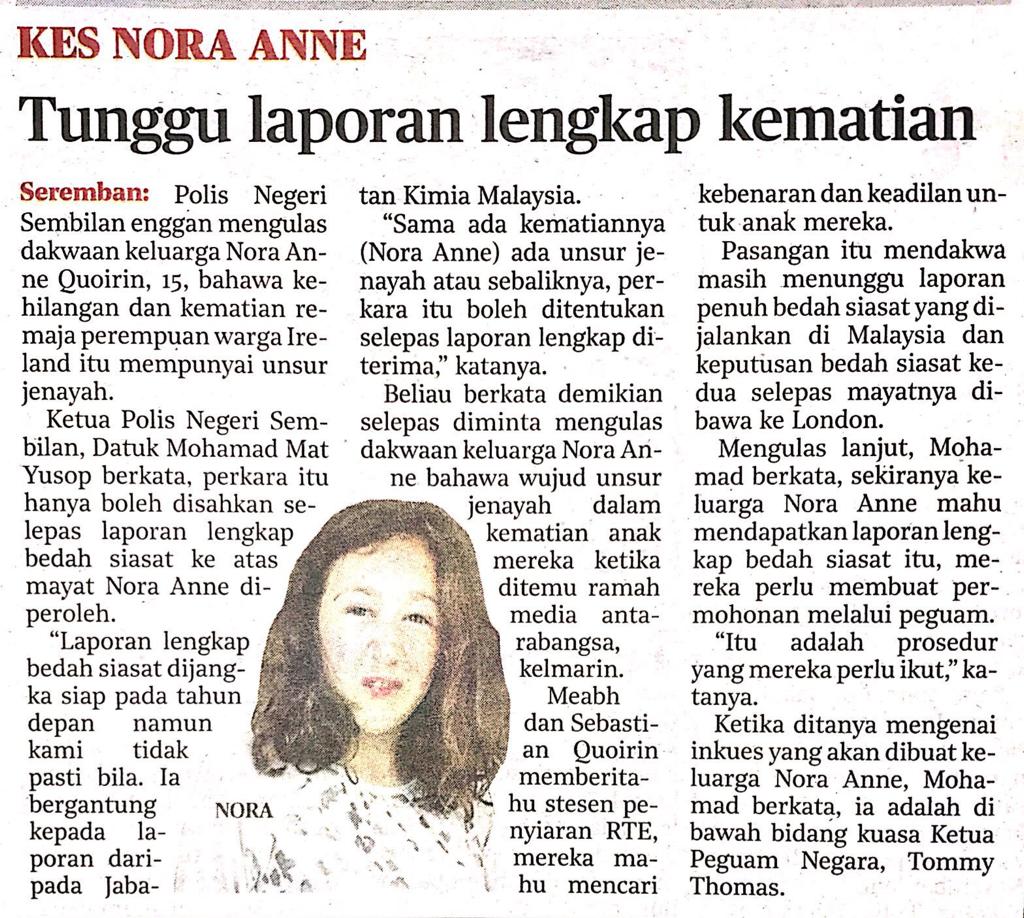 Tajuk :Tunggu laporan lengkap kematian Nora Anne