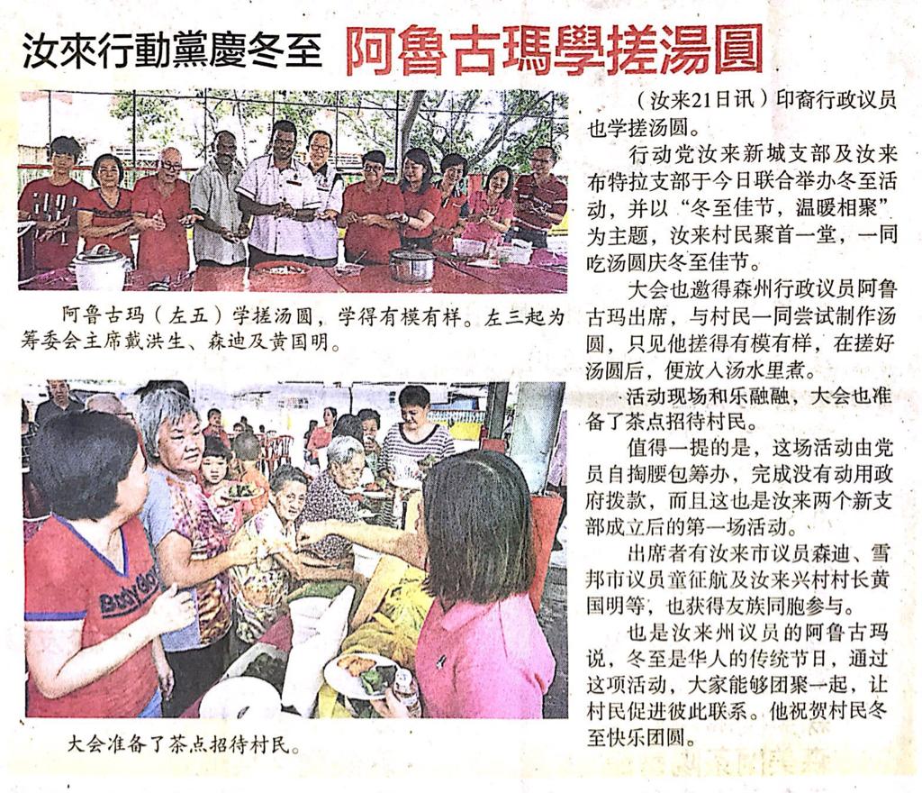 Tajuk : YB Tuan Cha Kee Chin turun melawat Bengkel Masakan Makanan Tradisional di Festival Winter Soltice yang dianjurkan oleh Jawatankuasa Kampung Batu 8 dan ahli Pusat Perkhidmatan Parlimen Rasah.Menurut beliau terdapat banyak resepi makanan tradisional yang di pertengahkan dalam bengkel ini.