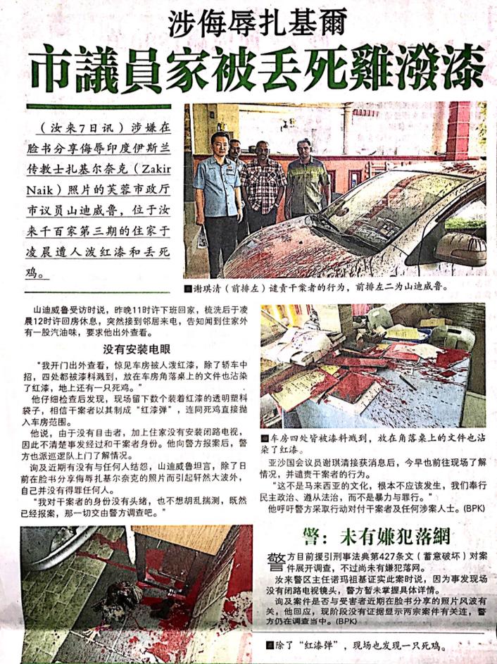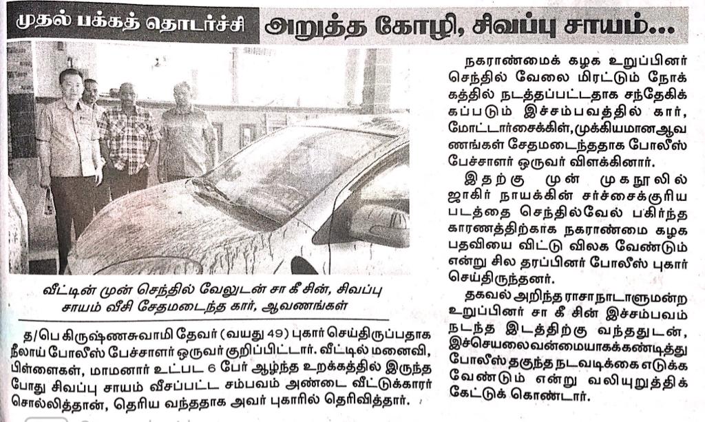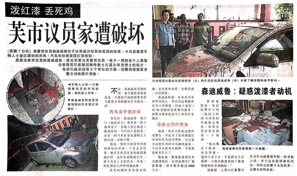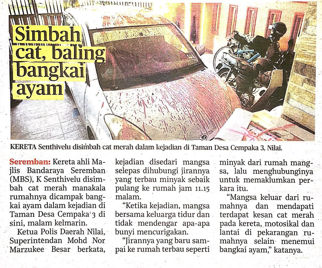 Tajuk :Nilai:YB Tuan Cha Kee Chin telah turun melihat keadaan di rumah Ahli Majlis Bandaraya Seremban (MBS), K Senthivelu dimana keretanya disimbah cat merah dan terdapat bangkai ayam yang telah di baling ke rumahnya.
