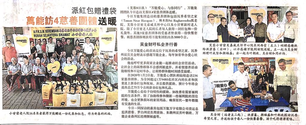 Tajuk :Seremban:YB Tuan Chew Seh Yong dan YB Ng Chin Tsai bersama Magnum Cares telah turun ke Rumah Sejahtera Sikamat membuat lawatan sosial dan juga memberi sumbangan kepada warga Rumah Sejahtera Sikamat.