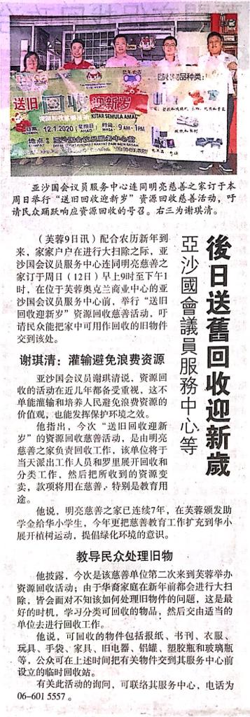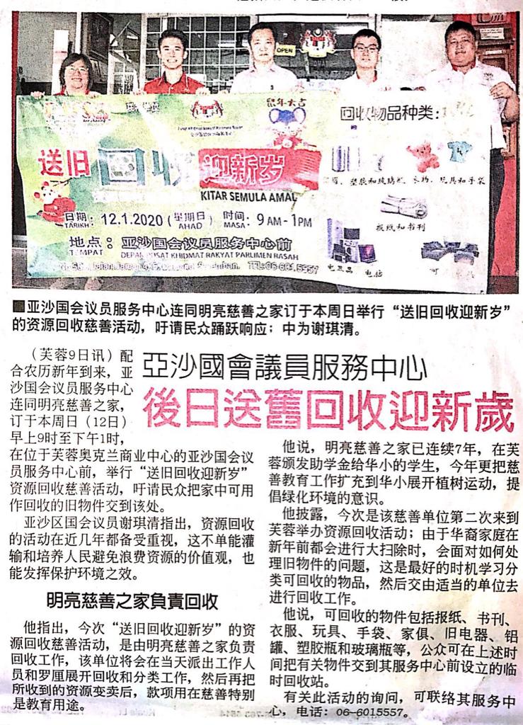 Tajuk :Seremban:YB Tuan Cha Kee Chin bersama ahli Pusat Khidmat Rakyat Parlimen Rasah mempromosikan Kempen Kitar Semula Amal yang bersempena sambutan Tahun Baru Cina yang bakal menjelang.Kempen tersebut akan berlangsung pada 12 Januari 2020 dan beliau mengalu-alukan kepada orang ramai untuk menyertai kempen ini.