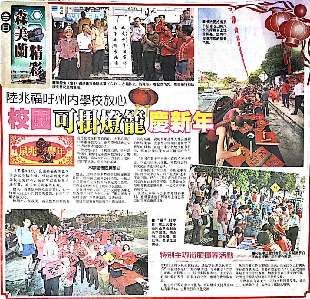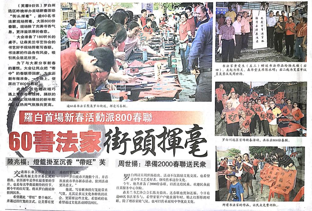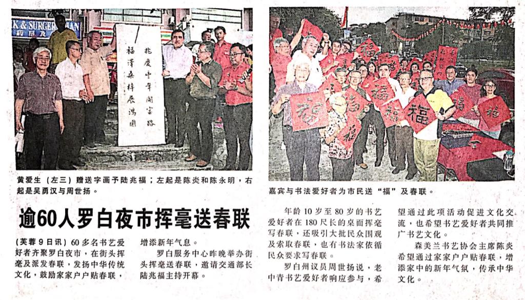 Tajuk :Seremban:YB Tuan Loke Siew Fook dan juga YB Tuan Chew Seh Yong telah turun menyertai Persatuan Penulis dan Kesenian Negeri Sembilan mengedarkan seni kaligrafi ‘Spring Festival’ di sekitar Pasar Malam Lobak bersempena Tahun Baru Cina yang akan datang.