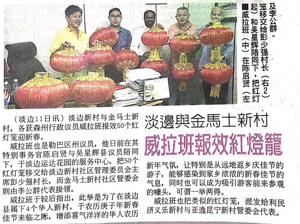 Tajuk :Tampin:YB Tuan Veerapan telah menyerahkan beberapa tanglung baru sempena sambutan Tahun Baru Cina yang bakal menjelang pada Kampung Baru Tampin dan juga Kampung Permata Baru Tampin.