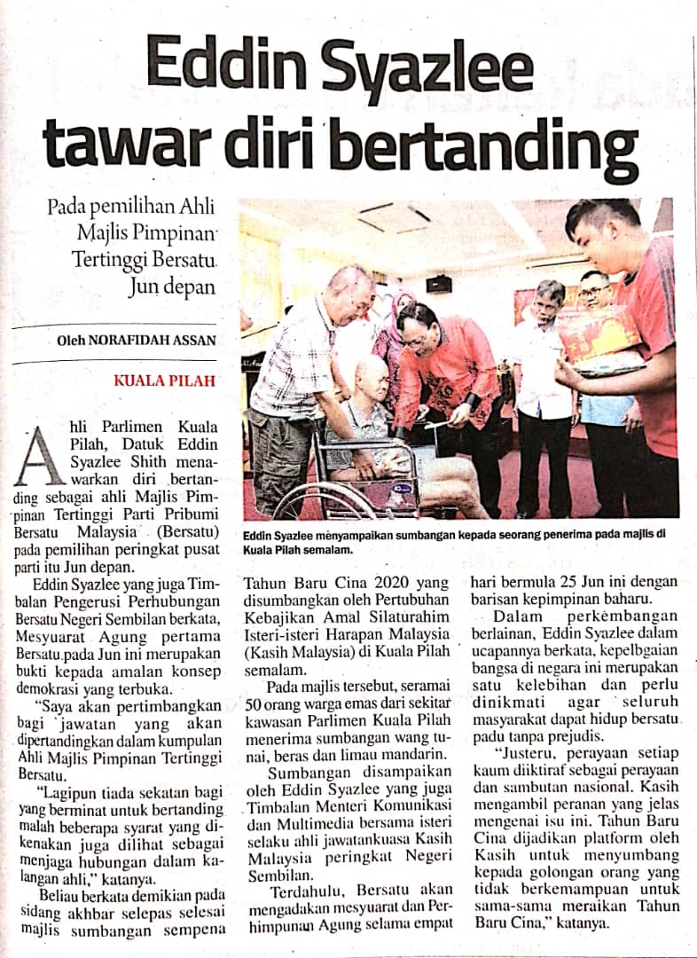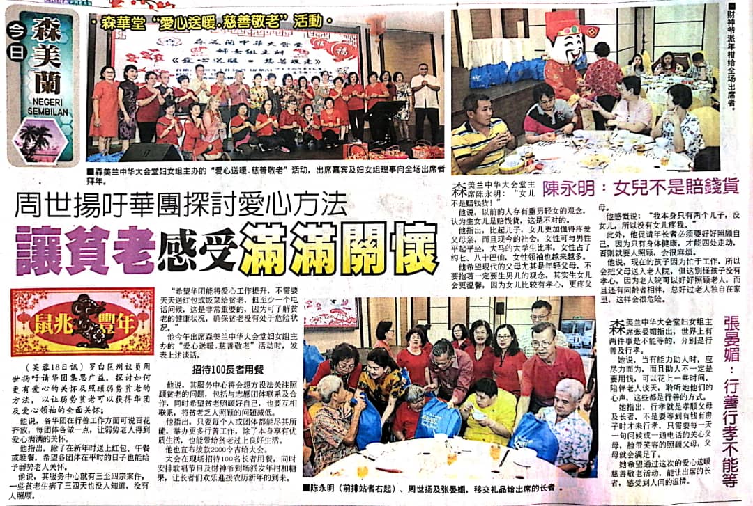 Tajuk :YB Tuan Chew Seh Yong berharap lebih banyak kumpulan atau persatuan membantu warga emas yang kurang bernasib baik dalam ucapan beliau di Majlis "Love, Warmth, Charity and Respect for the Elderly" anjuran Kumpulan Wanita Dewan Negeri Sembilan bagi meraikan 100 orang warga emas