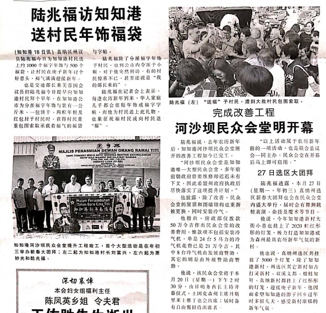 Tajuk :Jelebu: YB Tuan Loke Siew Fook mengedar perhiasan & hamper Tahun Baru Cina di Kampung Titi, Jelebu. Beliau juga memaklumkan bahawa Projek Penambahbaikan Dewan Orang Ramai Titi telah selesai dan akan dibuka kepada orang ramai mulai esok dan akan dirasmikan oleh Yang Teramat Mulia Dato' Mendika Menteri Akhirulzaman Undang Luak Jelebu.