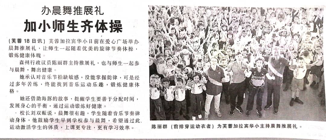 Tajuk :YB Nicole Tan Lee Koon dijemput menghadiri Majlis Pelancaran Program Senaman Pagi di SJKC Kelpin dan membuat senaman bersama-sama dengan guru-guru dan murid-murid.