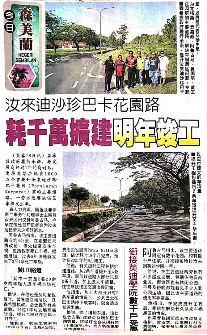 Tajuk :YB Tuan Arul Kumar menyatakan bahawa kerja-kerja menaiktaraf Persiaran Korporat, Bandar Baru Nilai kepada 4 lorong sedang dilaksanakan oleh pemaju Putra Nilai dan dijangka siap dalam masa 18 bulan. Selepas kerja-kerja menaiktaraf ini selesai, isu kemalangan dan kesesakan dapat diatasi.