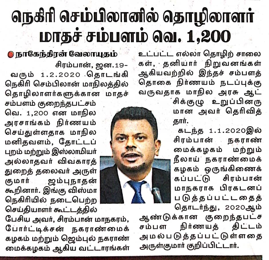 Tajuk :YB Tuan J. Arul Kumar berkata Kerajaan telah menetapkan gaji minimum sebanyak RM 1,200 melalui Perintah Gaji Minimum 2020. Kadar baru ini berkuatkuasa mulai 1.2.2020 dan terpakai kepada semua tempat kerja yang terletak dalam kawasan Majlis Bandaraya Seremban, Majlis Perbandaran Port Dickson dan Majlis Perbandaran Jempol.