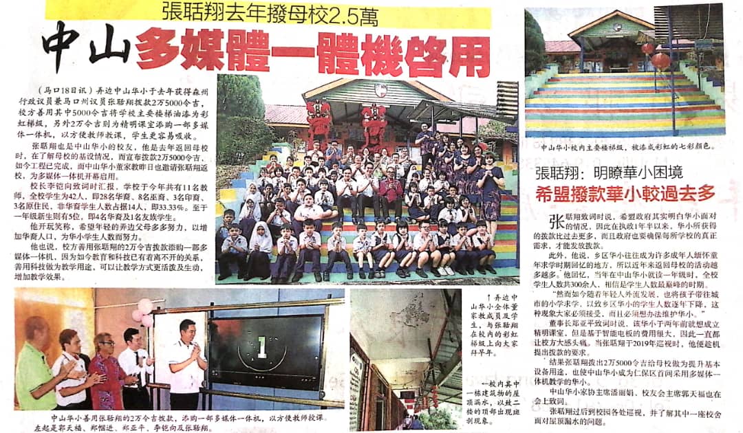 Tajuk :SJKC Chung San, Rompin memasang mesin pintar semua-dalam-satu (All-in-one) yang bernilai RM 20,000 dengan pembiayaan daripada Exco Kerajaan Negeri Sembilan, YB Tuan Teo Kok Seong serta menerima RM 5,000 untuk membina tangga pelangi. Mesin pintar tersebut bukan sahaja boleh meningkatkan kualiti pembelajaran pelajar, tetapi juga membolehkan guru menggunakan kaedah pengajaran yang berlainan seiring dengan teknologi.