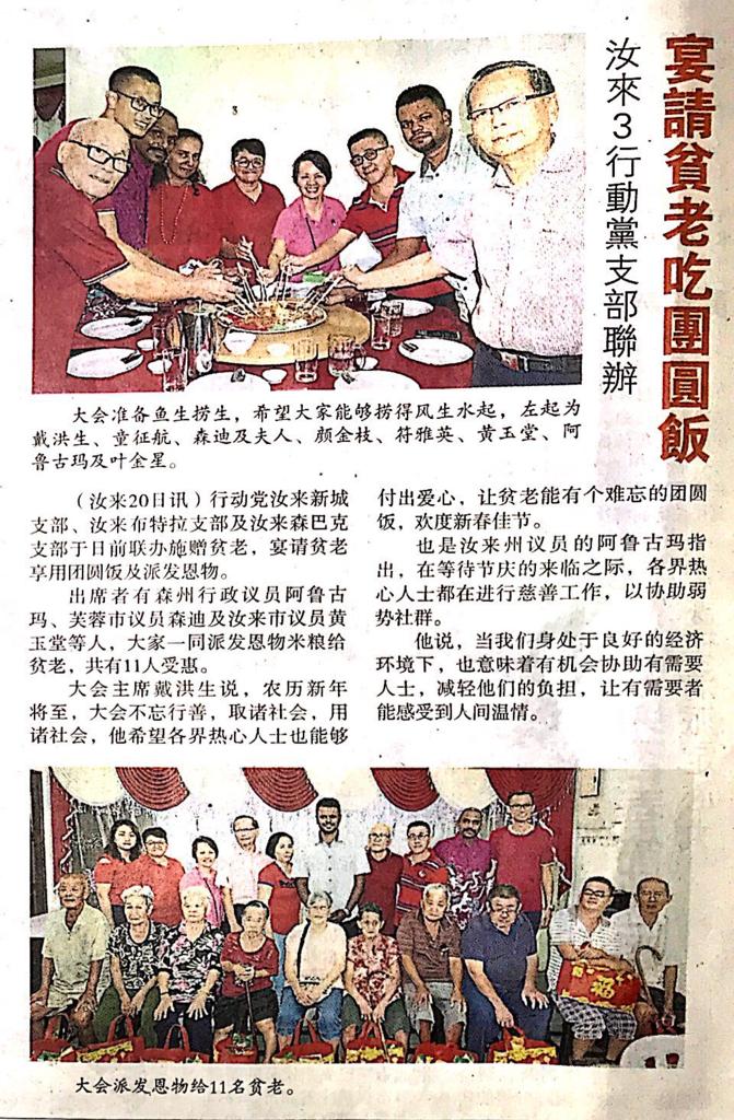 Tajuk :Nilai:YB Tuan Arul Kumar telah turun menyampaikan sumbangan kepada warga emas dan golongan yang kuran berkemampuan di jamuan makan yang dianjurkan oleh Jawatankuasa Bandar Baru Nilai dan Cawangan Putra Nilai sempena sambutan Tahun Baru Cina yang bakal menjelang nanti.