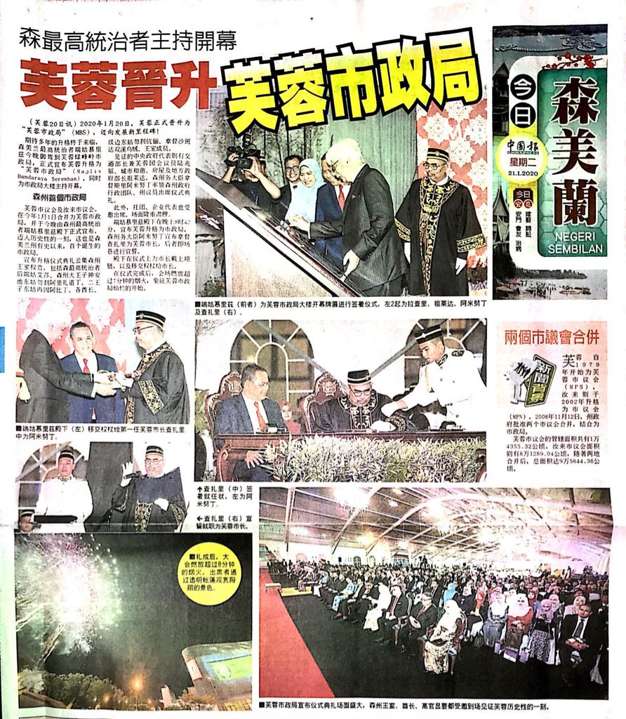 Tajuk :Seremban:Duli Yang Maha Mulia Yang Di-Pertuan Besar Negeri Sembilan Darul Khusus,Tuanku Muhriz Ibni Almarhum Tuanku Munawir telah menyistiharkan Majlis Bandaraya Seremban sebuah bandaraya di dalam Istiadat Pengisytiharan Majlis Bandaraya Seremban dan Perasmian Wisma MBS. Upacara istiadat pengisytiharan bermula apabila Menteri Perumahan dan Kerajaan Tempatan,YB Puan Zuraida Kamaruddin menyerahkan Surat Cara pengurniaan taraf bandar raya kepada baginda sebelum baginda menyerahkannya kepada MBNS.