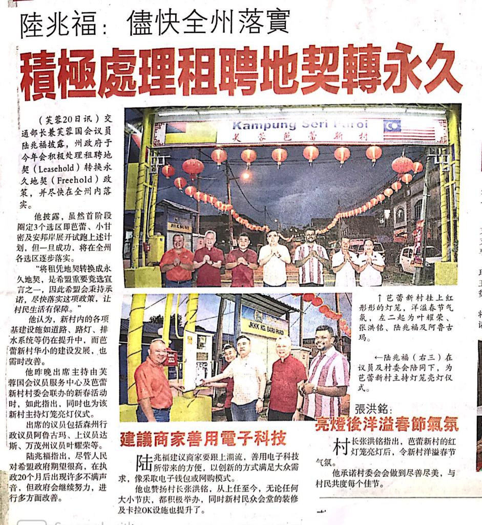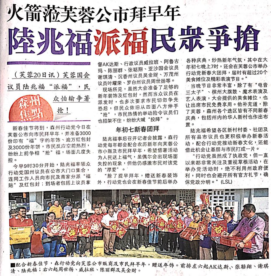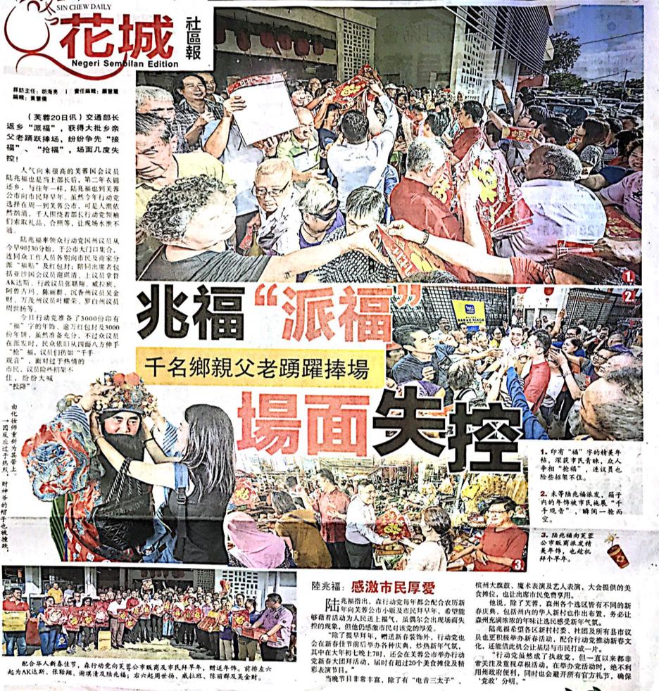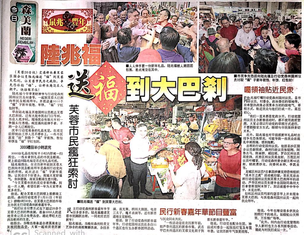 Tajuk :Seremban:YB Tuan Loke Siew Fook bersama YB Tuan Teo Kok Seong,YB Tuan Cha Kee Chin,YB Tuan Ng Chin Tsai,YB Puan Nicole Tan Lee Koon,YB Tuan Veerapan,YB Tuan Chew Seh Yong dan juga YB Tuan Arul Kumar telah berkumpul di Pasar Besar Seremban bagi mengagihkan perhiasan sempena Tahun Baru Cina dan juga kuih-kuih serta ang pau kepada orang ramai yang berkunjung di pasar tersebut.