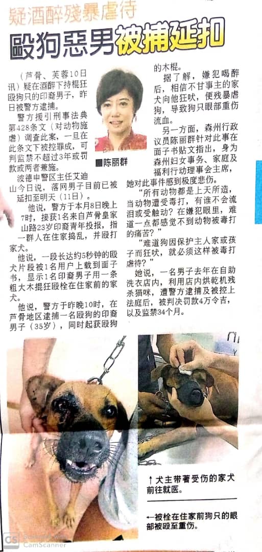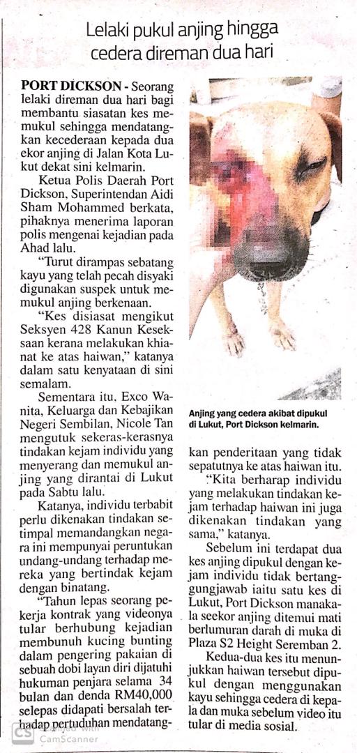 Tajuk :Seremban- Exco Hal Ehwal Wanita, Keluarga dan Kebajikan Negeri Sembilan, YB Nicole Tan Lee Koon melahirkan rasa sedih atas kejadian yang berlaku Sabtu lepas bertempat di Lukut dimana seorang individu yang menyerang dan memukul haiwan peliharaan.
