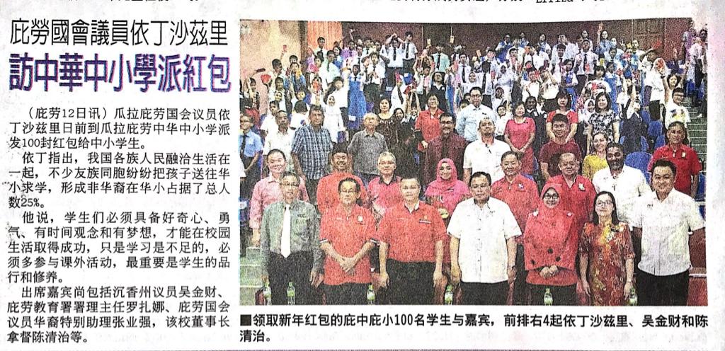 Tajuk :Kuala Pilah:YB Tuan Eddin Syazlee Shith dan juga YB Tuan Ng Chin Tsai telah hadir ke Program Sumbangan Angpau Sempena Tahun Baru Cina di SJKC Chung Hua Kuala Pilah.
