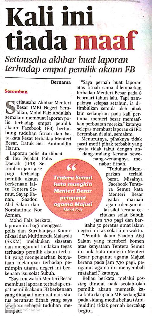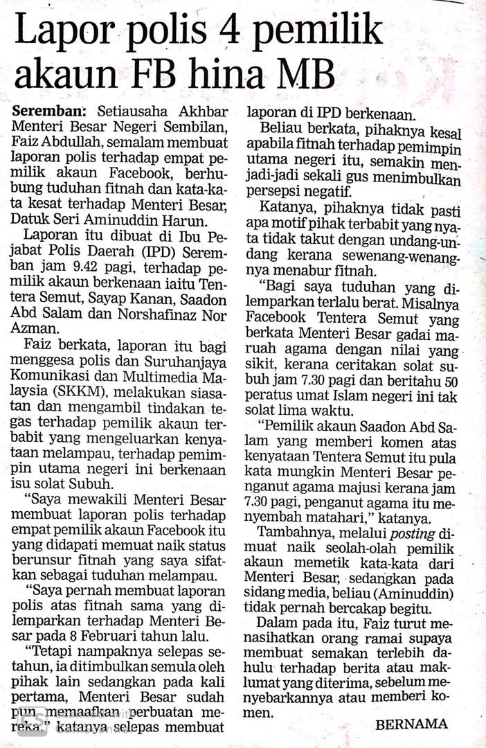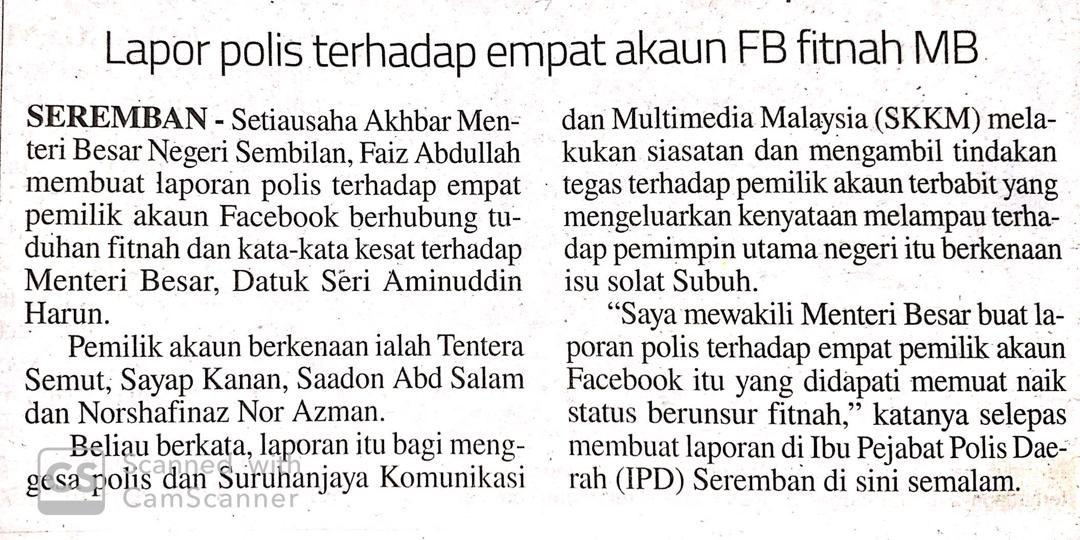 Tajuk :Lapor polis terhadap empat akaun FB fitnah MB