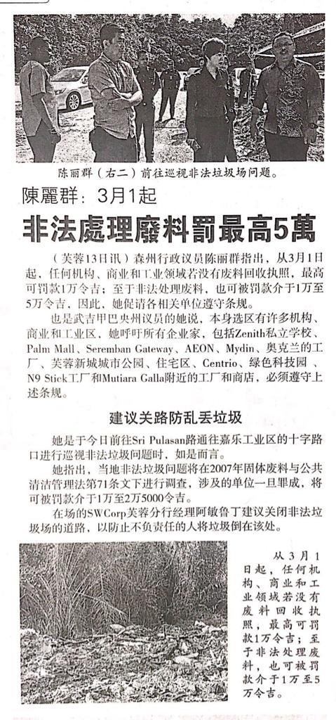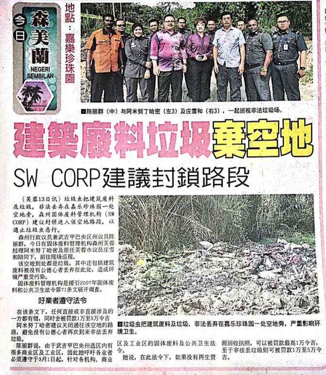 Tajuk :YB Puan Nicole Tan Lee Koon:Mulai 1 Mac,pembuangan sampah secara haram akan didenda sehingga RM 50,000.