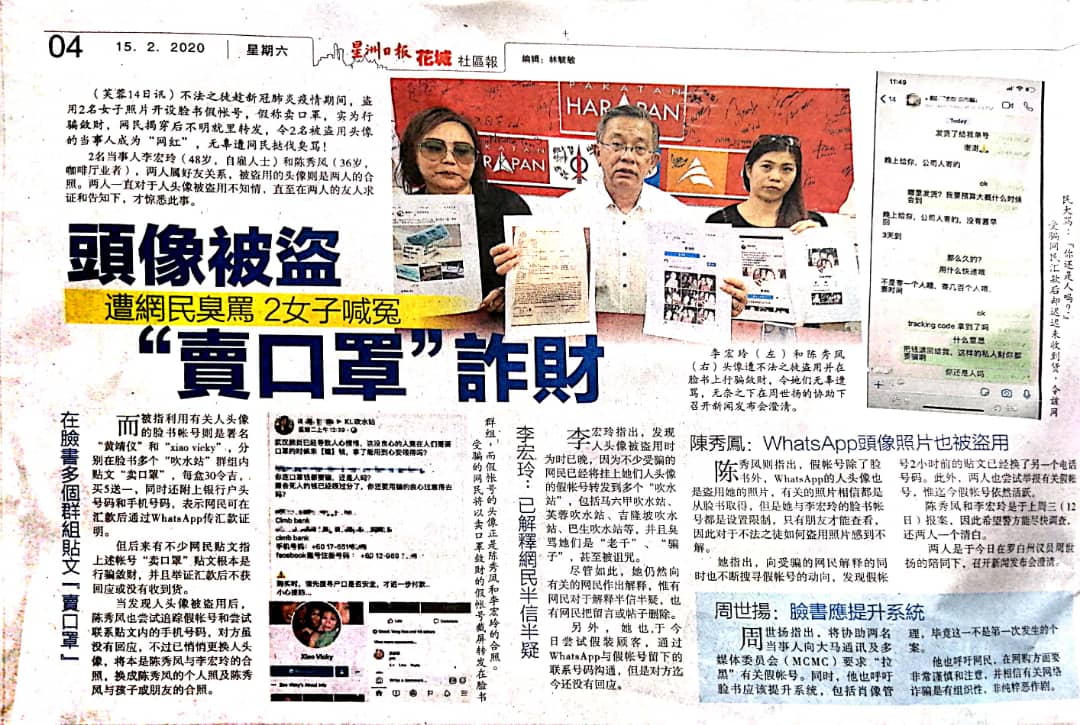 Tajuk :ADUN Lobak, YB Tuan Chew Seh Yong menjelaskan bahawa kedua-dua wanita tersebut adalah mangsa kepada penipuan di mana gambar mereka berdua telah dicuri dan membuka akaun Facebook palsu dengan mendakwa menjual topeng muka.