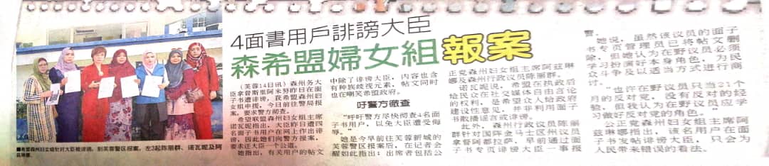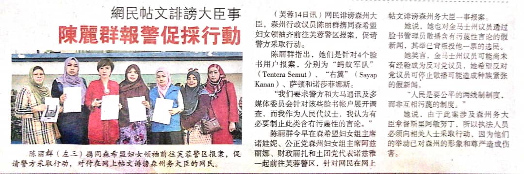 Tajuk :Exco Hal Ehwal Wanita dan Kebajikan, YB Puan Nicole Tan Lee hKoon dan Ketua Wanita Pakatan Harapan NS, Pn. NOWANI Ahmat, Pn. Azlinah Zamli (Ketua Wanita PKR NS), Pn. Nordziah (wakil wanita PPBM dan Pn. Liza (Bendahari PKR NS) telah ke IPD Seremban 2 untuk membuat laporan polis ke atas 4 akaun Facebook iaitu Tentera Semut, Sayap Kanan, Saadon Abd Salam dan Norshafinaz bt. Nor Azman kerana memfitnah Menteri Besar Negeri Sembilan.