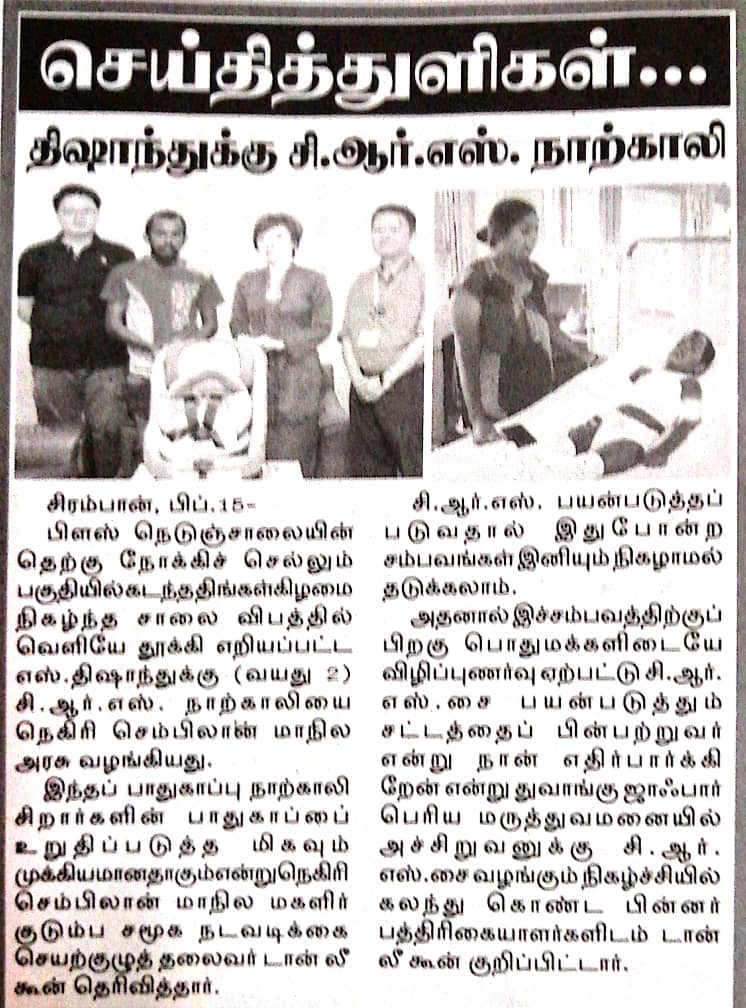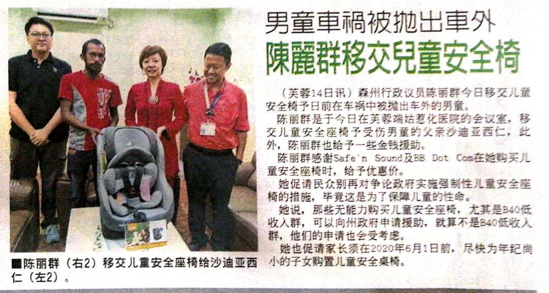 Tajuk :Exco Hal Ehwal Wanita dan Kebajikan, YB Puan Nicole Tan Lee Koon telah menghadiahkan satu kerusi keselamatan kanak-kanak (CRS) dan sedikit sumbangan kewangan kepada keluarga Encik Satthiaseelan.