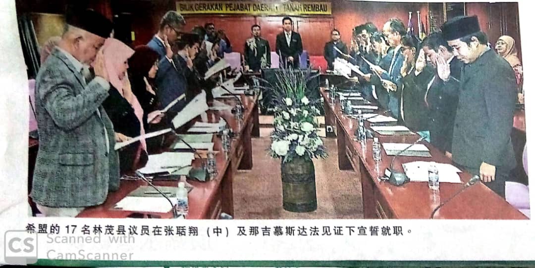 Tajuk :Rembau- Majlis Angkat Sumpah Penerimaan Jawatan Ahli Majlis di Bilik Gerakan ,Pejabat Daerah Rembau semalam sambil disaksikan oleh YB Tn Teo Kok Seong, EXCO Kesejahteraan Bandar,Perumahan Kerajaan Tempatan dan Kampung Baru.