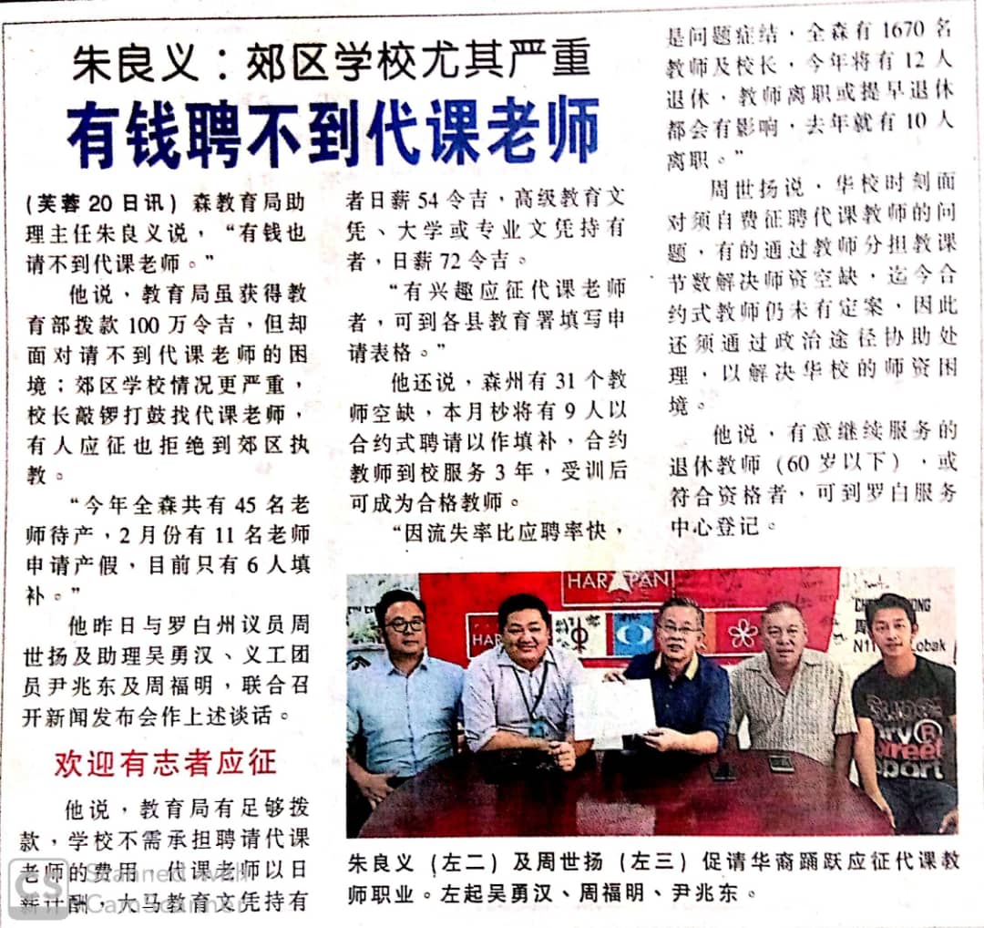 Tajuk :Seremban- YB Tn Chew Seh Yong, DUN Lobak menyeru kepada sesiapa yang berkelayakan mengisi kekosongan sebagai guru gantian boleh memohon segera berikutan ramai guru yang sedang bercuti dan kekurangan guru pengganti.