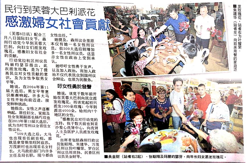 Tajuk :YB Yap Yew Weng, YB Ng Chin Tsai, YB Choo Ken Hwa, YB Teo Kok Seong serta YB Mary Josephine Prittam Singh mengedarkan 1,000 kuntuman bunga mawar kepada wanita-wanita di sekitar Seremban sebagai menghargai jasa sempena Sambutan Hari Wanita Antarabangsa.