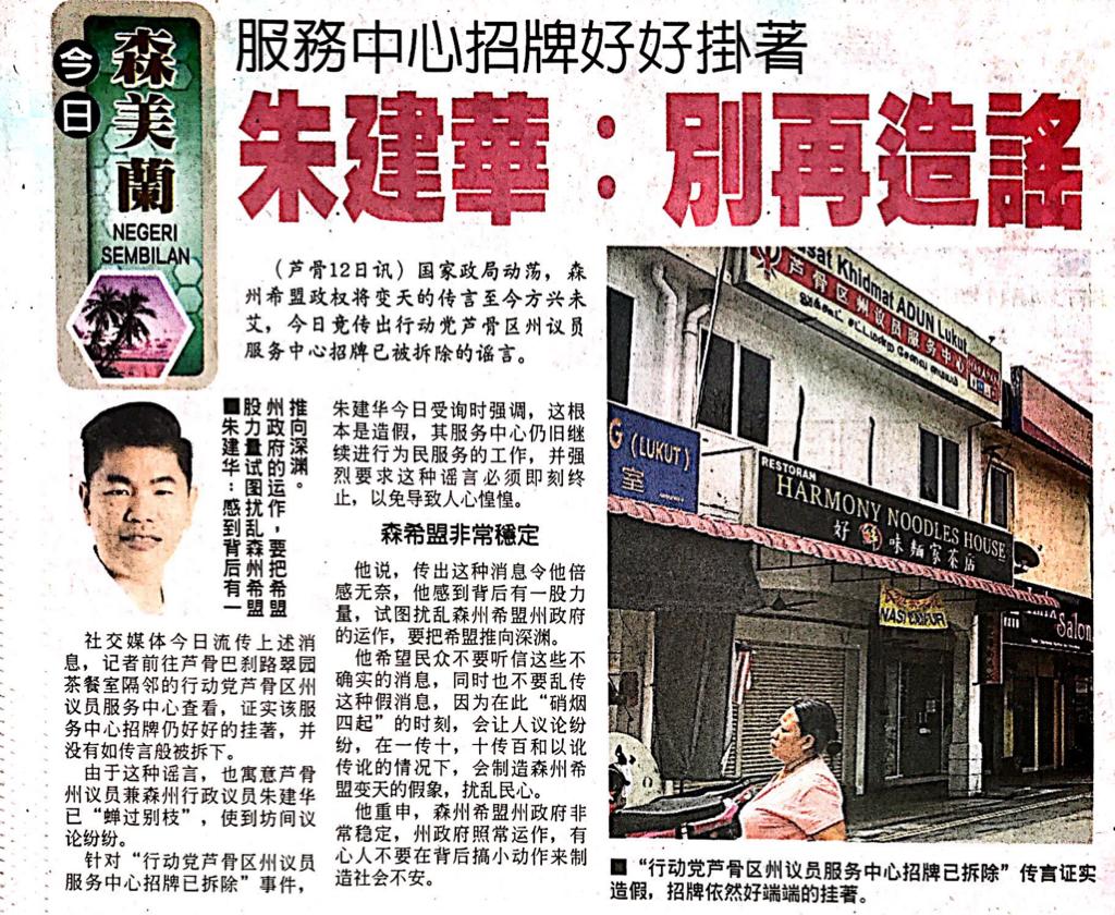 Tajuk :Lukut:YB Tuan Choo Ken Hwa menegaskan bahawa Pusat Khidmat ADUN Lukut masih berada di tempat yang sama dan masih beroperasi seperti biasa dan beliau juga menegur kepada pihak yang tidak bertanggungjawab supaya berhenti menyebarkan khabar yang tidak benar.