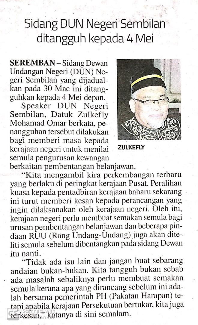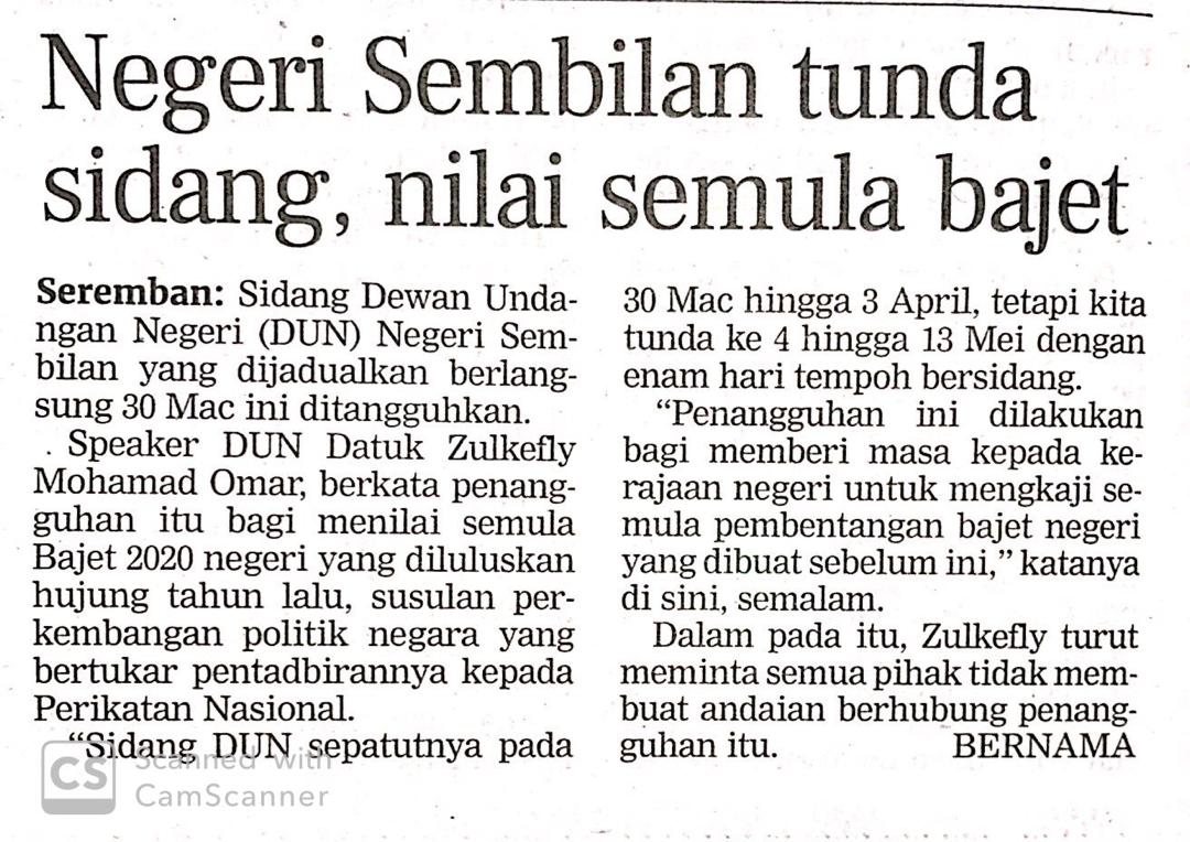 Tajuk :Sidang DUN Negeri Sembilan ditangguh kepada 4 Mei