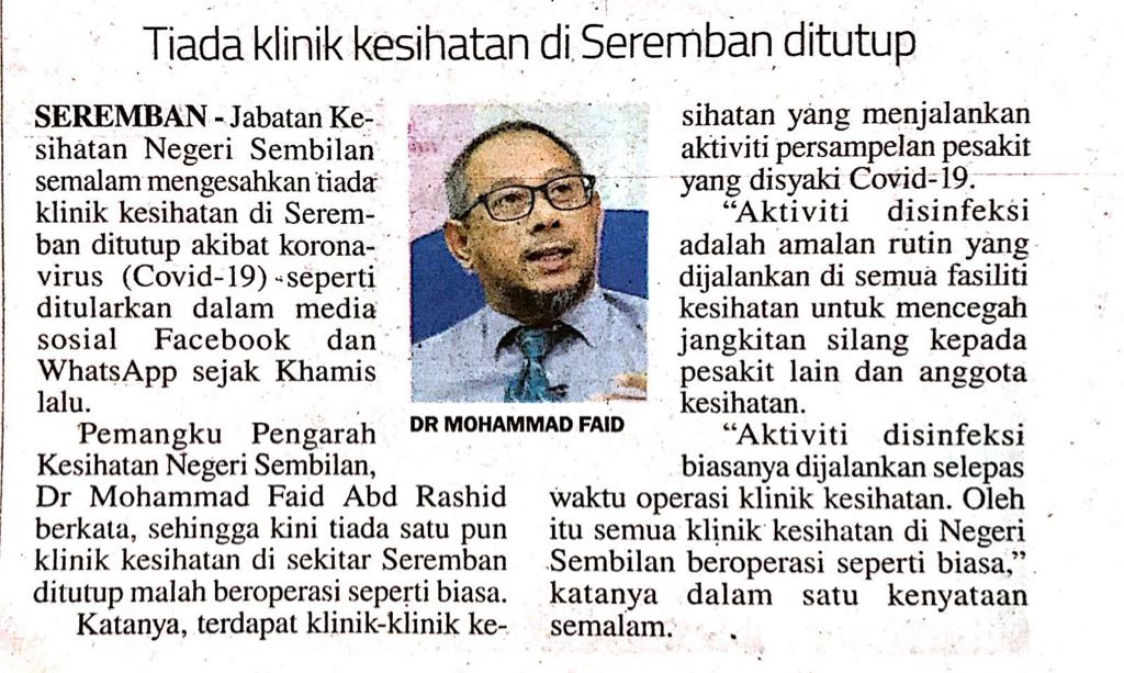Tajuk :Tiada klinik kesihatan di Seremban ditutup
