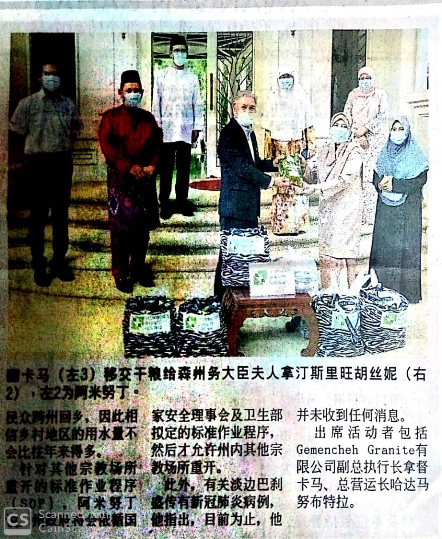 Tajuk :Seremban- Datin Seri Hajah Wan Hasni bt Wan Yusof selaku YDP Badan Kebajikan Isteri Wakil-wakil Rakyat dan Pegawai Kanan Kerajaan Negeri Sembilan (BAKRIYAH NS) merakamkan ucapan terima kasih kepada Kumpulan Gemencheh Granite Sdn Bhd atas sumbangan hari raya yang disampaikan.