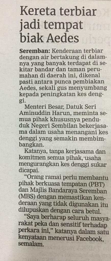 Tajuk :Kereta terbiar jadi tempat biak Aedes