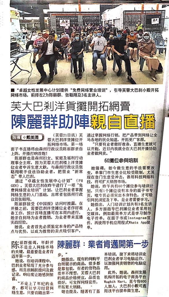 Tajuk :Seremban:YB Puan Nicole Tan Lee Koon telah merasmikan program "Kursus Perniagaan Online" anjuran PH Gem (Power House Wanita Gemilang) di Pasar Besar Seremban pada 20 Jun 2020.