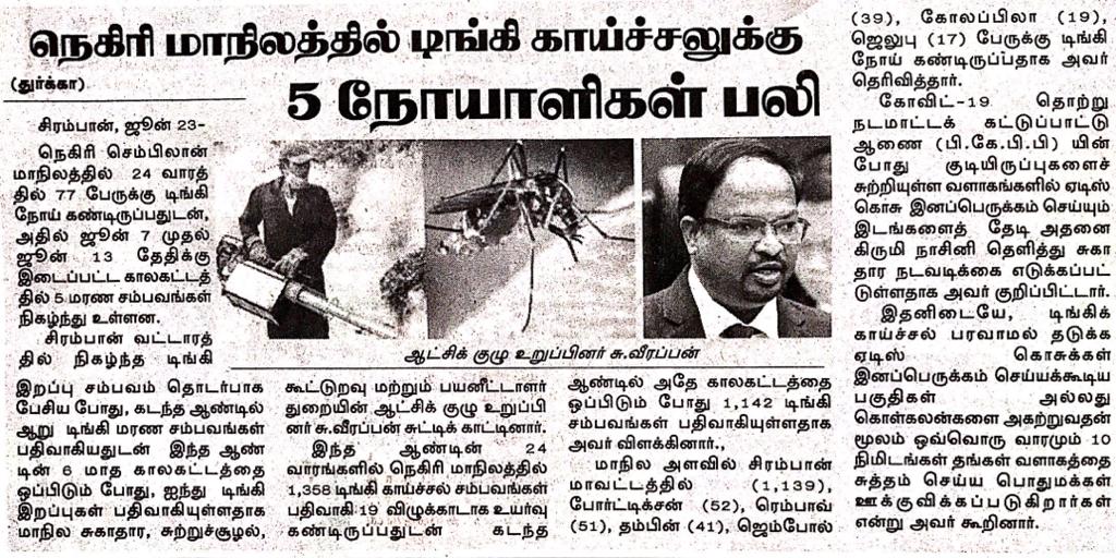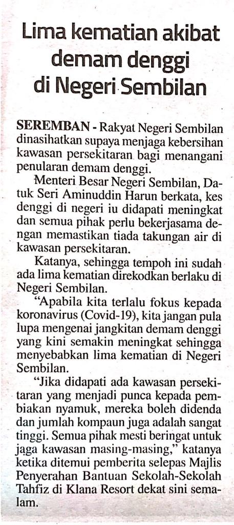 Tajuk :Seremban:Lima kematian pesakit denggi di Negeri Sembilan telah dilaporkan.