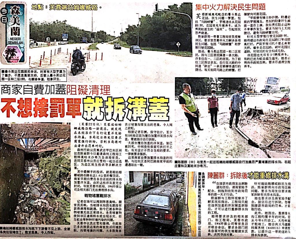Tajuk :Seremban:YB Puan Nicole Tan Lee Koon telah turun untuk meninjau keadaan di Jalan Tuanku Munawir dimana beliau mendapat aduan bahawa pihak JKR tidak dapat membuat kerja-kerja penyelenggaraan longkang yang dilaksanakan setiap bulan kerana longkang tersebut ditutup penuh konkrit sehingga menyebabkan kebanjiran di kawasan tersebut dari semasa ke semasa.