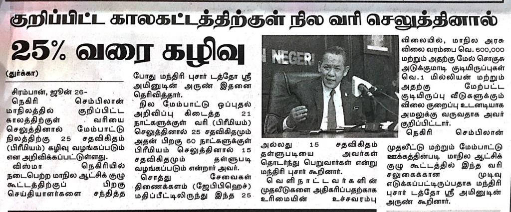 Tajuk :Seremban:Kerajaan negeri memberi potongan 15 dan 25 peratus bagi bayaran premium tanah pertanian yang ditukar syarat untuk dimajukan sebagai projek hartanah.